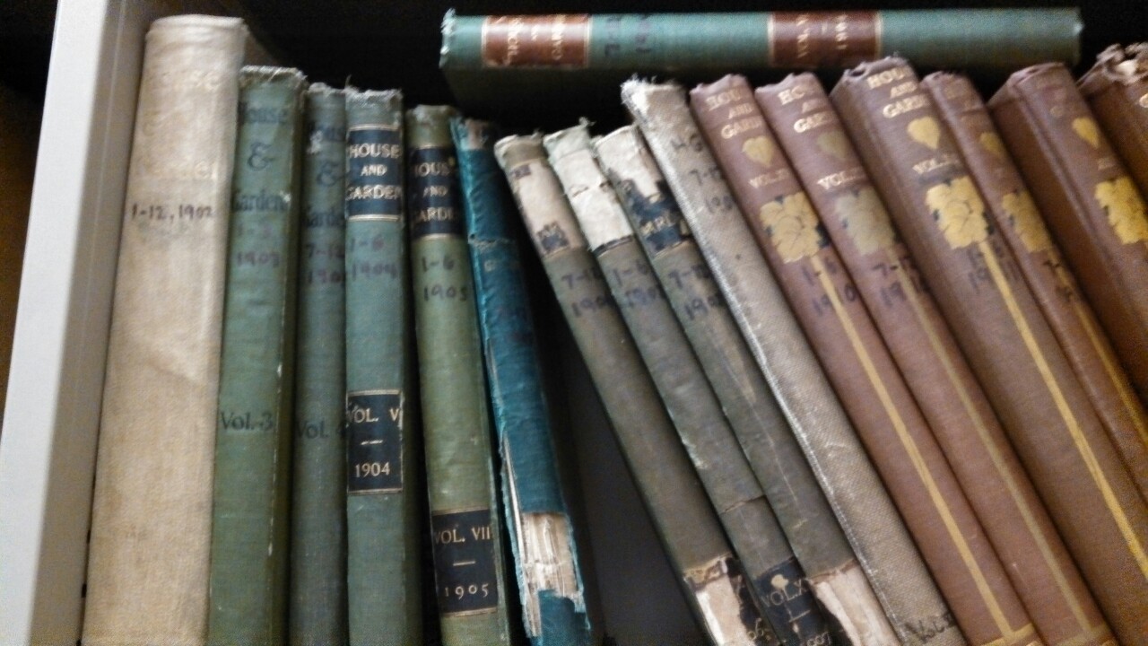 Field trip: House and Garden, volumes from 1904 to 19teens, Condé Nast Library. 1904 to 1906 contains stories on designs for the Manhattan Bridge and a new entrance to Central Park at 59th street. Also an article on estimating home improvement costs (the merits of a $48/dozen box of lighting globes versus an already shocking $12), retiring to a farm, living in the city on less $15 a week (author couldn’t find a job for more than $9 and chose to go back to the farm). Also lovely pictures of English and Italian public gardens and a piece on “the old garden bookshelf” reviewing guides from the 17th and 18th century (Milton, Walpole). Except for a few woodcut prints and art nouveau details, most of the ads would be at home in today’s yellow pages. I looked at old Vogues, too.